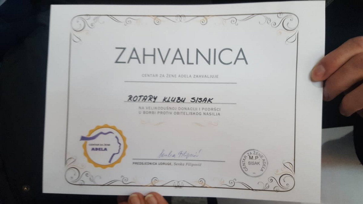 Predsjednici Centra za žene Adela Senki Filipović donaciju je, u ime Rotary kluba Sisak, predao predsjednik Andrej Butorac. Na primopredaji su, uz predsjednika kluba, bili i članovi Milan Sladojevic, te Lana Vanić. Hvala im na ovoj vrijednoj donaciji!